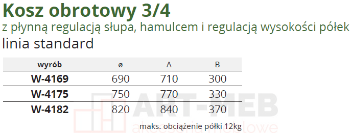 Kosz obrotowy śr. 820 3/4 z płynną regulacją słupa, hamulcem i regulacją wysokości półek P22 SREBRNY W-4182