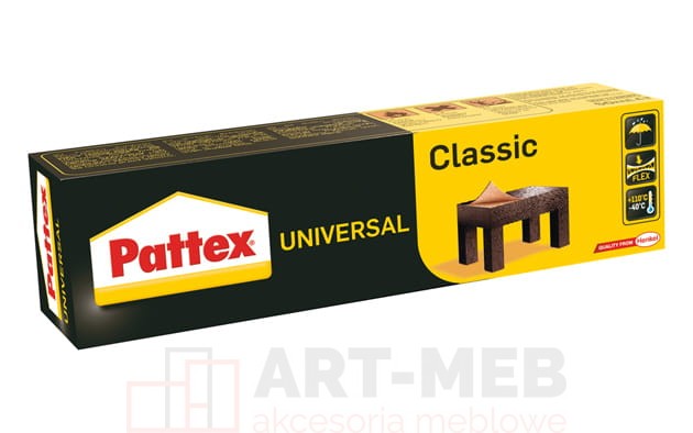 Uniwersalny klej Pattex Universal Classic to klej z przeznaczeniem do klejenia drewna, materiałów drewnianych z płytami dekoracyjnymi wykonanymi z tworzyw sztucznych. Klej ten świetnie sprawdza się również podczas układania izolacji dźwiękoszczelnej i płyt akustycznych. Może być używany do klejenia płytek z tworzyw sztucznych i okładzin ściennych. Należy jednak pamiętać, by nie używać go z płytami polistyrenowymi i miękkimi płytami PCW-U i sztuczną skórą. Jest również z powodzeniem używany do klejenia taśm fornirowych oraz przy uszczelnianiu brzegów litych elementów drewnianych. Chroni przed wilgocią, a także niesprzyjającymi warunkami atmosferycznymi.