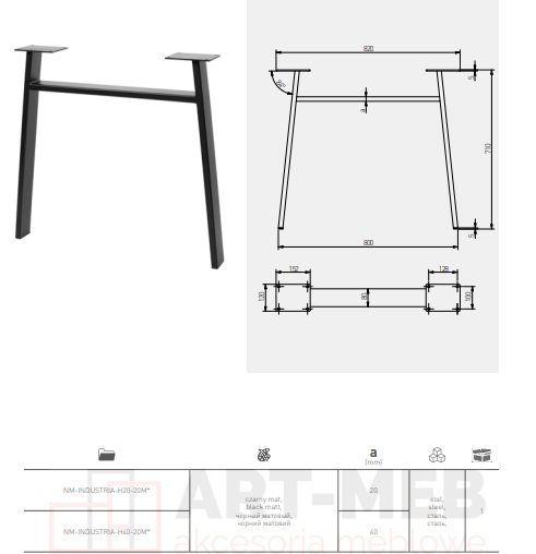 Noga stelażowa GTV INDUSTRIA, trapez z poprzeczką, H=710 mm, W=820 mm, profil 80 x 40, stal, czarny