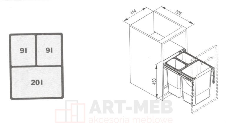 Pojemnik na odpady JC606 WYSOKI FRONT 45 potrójny 2x9l+1x20l +mocowanie frontu