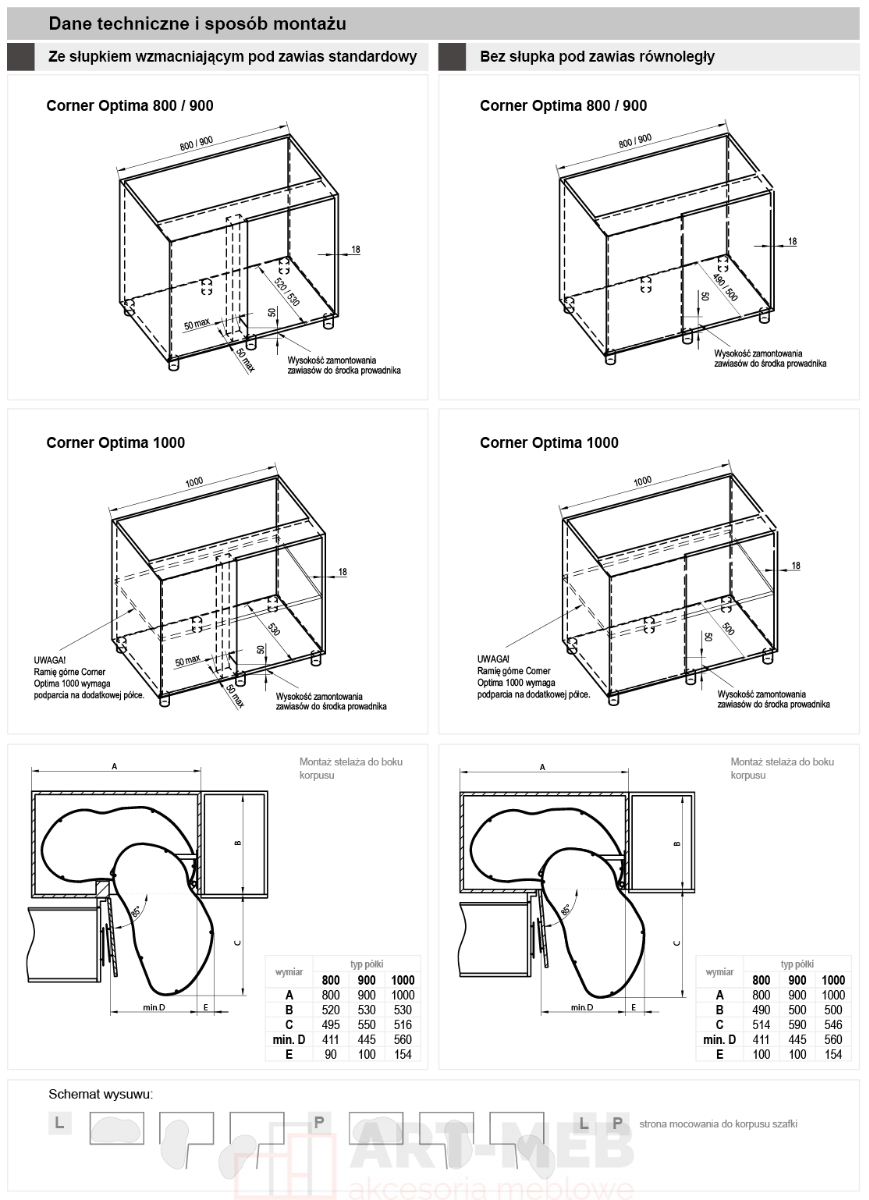 - montaż do szafki narożnej z frontem na zawiasach standardowych lub równoległych