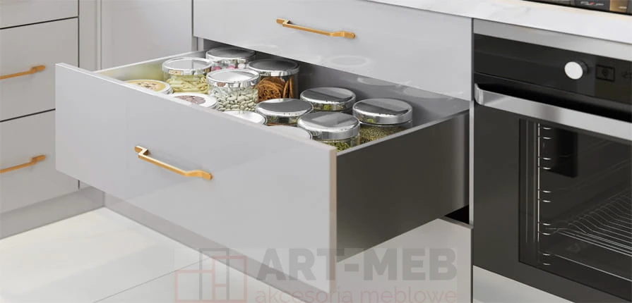 - Pełny wysuw: Zastosowane prowadnice pozwalają na całkowite wysunięcie szuflady, co zapewnia swobodny dostęp do zawartości nawet w najgłębszych zakamarkach.