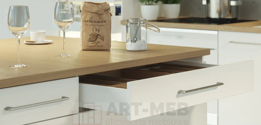 - Pełny wysuw: Zastosowane prowadnice pozwalają na całkowite wysunięcie szuflady, co zapewnia swobodny dostęp do zawartości nawet w najgłębszych zakamarkach.