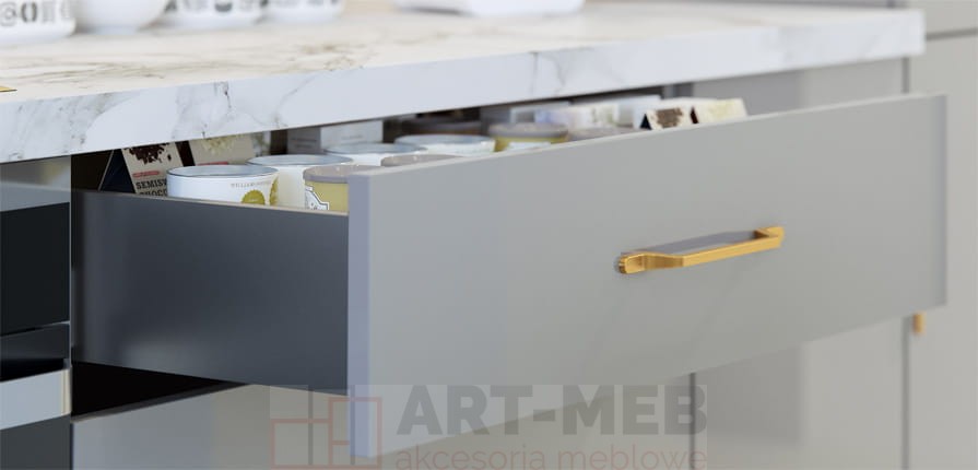 - Pełny wysuw: Zastosowane prowadnice pozwalają na całkowite wysunięcie szuflady, co zapewnia swobodny dostęp do zawartości nawet w najgłębszych zakamarkach.