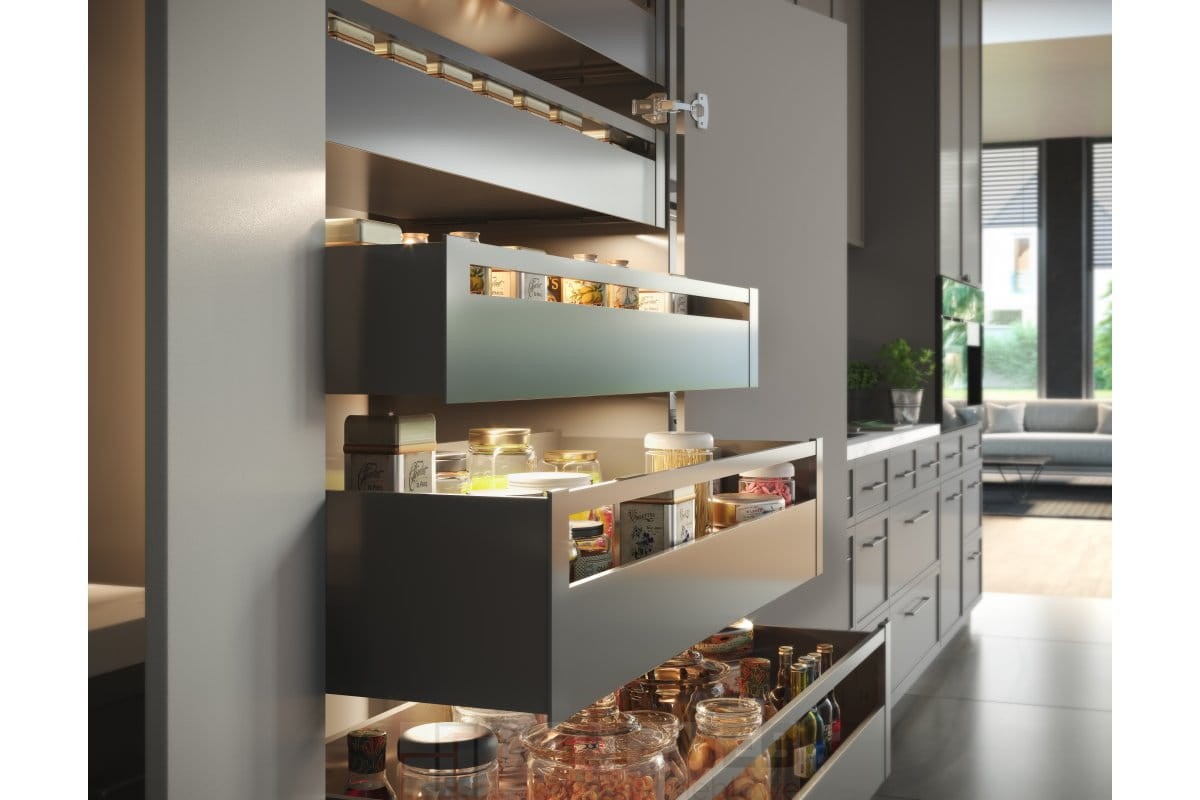 - Smukłe boki (tylko 14 mm): Nowoczesny profil boku zwiększa pojemność wewnętrzną szuflady, nadając jej lekki i elegancki wygląd.