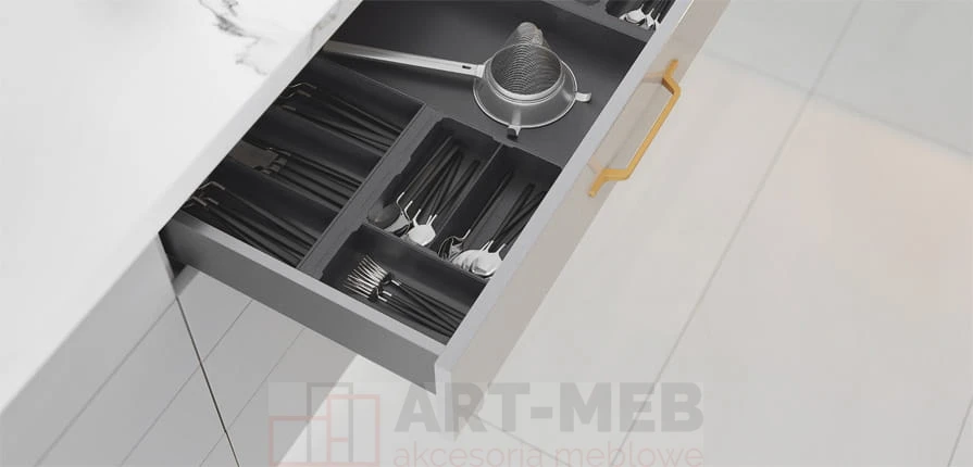 - Smukłe boki (tylko 14 mm): Nowoczesny profil boku zwiększa pojemność wewnętrzną szuflady, nadając jej lekki i elegancki wygląd.