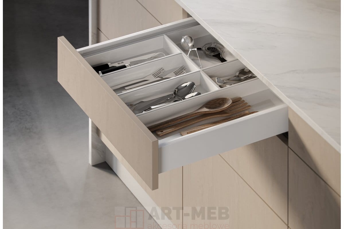 - Smukłe boki (tylko 14 mm): Nowoczesny profil boku zwiększa pojemność wewnętrzną szuflady, nadając jej lekki i elegancki wygląd.
