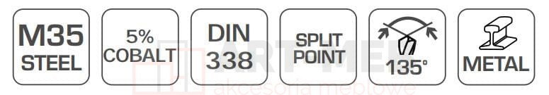 Charakterystyka wykonane z bardzo wytrzymałej, hartowanej stali szybkotnącej M35 z 5% dodatkiem kobaltu, który zapewnia wytrzymałość cieplną precyzyjnie wykonane i ostrzone technologia split point, dzięki zastosowaniu specjalistycznego szlifu umożliwia samocentrujące wiercenie również na owalnych powierzchniach bez punktowania kąt wierzchołkowy 135° wyprodukowane zgodnie z europejską normą DIN 338 trzpień cylindryczny